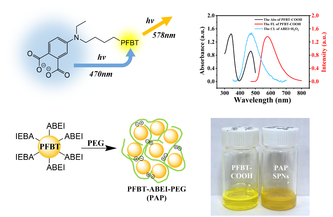 本研究设计并合成了一种新型半导体聚合物纳米粒子PFBT-ABEI-PEG(PAP SPNs),它由聚[(9,9-二辛基芴基-2,7-二基)-alt-(苯并[2,1,3]噻二唑-4,8-二基)](PFBT)主链、N-(4-氨丁基)-N-乙基异鲁米诺(ABEI)侧链和聚乙二醇(PEG)组成。侧链ABEI既是过氧化氢的反应单元又是能量供体,而主链PFBT既是光敏剂又是能量受体。PFBT可被ABEI氧化发出约为460 nm的蓝光激发,从而无需外部光源即可产生化学发光信号。同时,通过引入聚乙二醇(PEG)长链,研究了半导体聚合物纳米粒子的不同形态,从而提高了SPNs的CRET效率和化学发光稳定性。因此,成功开发出基于分子内CRET的PAP SPNs高灵敏度新化学发光探针,并成功应用于细胞内的过氧化氢的检测,不仅简化了检测过程,还提高了检测的灵敏度和可靠性,为相关疾病研究提供了全新的科学工具和应用前景。