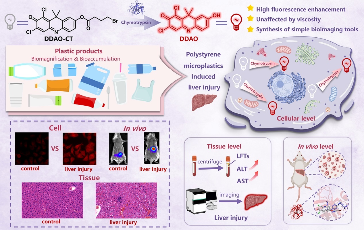 聚苯乙烯(PS)微塑料污染具有环境持久性和生物累积性,可诱发氧化应激和肝损伤,严重威胁健康。然而,其致肝毒性的机制尚缺乏动态成像工具阐明。本研究开发了远红荧光探针DDAO-CT(674 nm),基于羟基取代DDAO设计,用于可视化在PS肝损伤中显著上调的关键酶——胰凝乳蛋白酶活性。探针通过4-溴丁酰基识别基团与DDAO偶联,其荧光因分子内电荷转移(ICT)受阻而淬灭。胰凝乳蛋白酶水解后,ICT恢复,触发14倍荧光增强,检测限达3.5 ng/mL。该探针具高选择性、低毒性,在体外及PS暴露肝细胞中响应优异。小鼠活体成像显示,肝脏荧光信号呈剂量依赖性增强,与组织病理损伤及血清肝损伤标志物升高紧密相关。研究首次证实PS生物累积可直接触发胰凝乳蛋白酶活化。这一发现使DDAO-CT成为可视化污染物致肝功能障碍的有效工具,构建了环境肝毒素无创评估的化学生物学平台,为阐明微塑料肝损伤的酶水平机制提供了新视角。