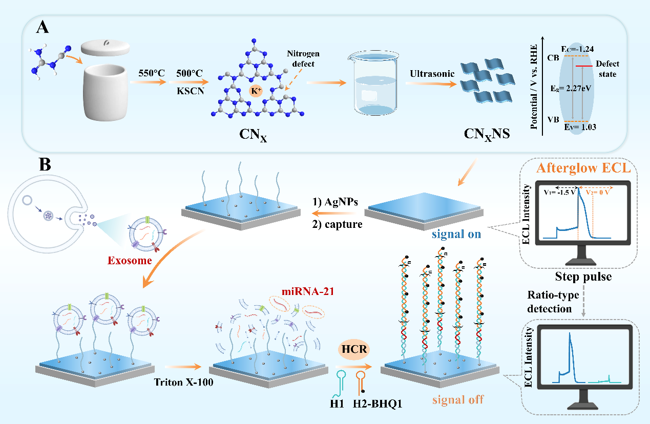 针对这一问题,研究团队首次提出基于余辉电化学发光的单发光体比率型ECL新策略。研究团队通过缺陷工程调控石墨相氮化碳,构建了具有氮缺陷电子态的碳氮化物材料(CNXNS)。在脉冲电位激发条件下,材料中的缺陷态可暂时储存注入电子,并在电位终止后逐渐释放,从而产生持续发光的余辉ECL现象。由于常规ECL信号与余辉ECL信号来源于同一发光中心,这两种信号天然具有内在关联,可构建无需双发光体的自参考比率检测模式,从根本上避免了传统比率体系中信号不匹配的问题。实验结果表明,在含1 mM S2O82−的0.1 M PBS溶液中,对CNXNS修饰的电极施加−1.5 V脉冲电位20 s后,在电激发终止条件下仍可观察到持续约12 s的阴极余辉ECL信号,验证了缺陷态诱导的余辉发光行为。这一发现为构建时间分辨与比率检测相结合的新型ECL分析模式提供了重要基础。在此基础上,作为概念验证,研究团队进一步构建了基于单发光体的比率型ECL传感平台,并将其应用于外泌体microRNA的超灵敏检测。通过杂交链式反应(HCR)在电极表面引入BHQ-1标记的DNA链,实现对常规ECL与余辉ECL信号的差异化调控,从而获得具有内在自校准能力的比率信号输出。该策略有效降低背景干扰,提高检测灵敏度,实现了对miRNA-21的高灵敏检测,并在实际样本分析中表现出良好的应用潜力。